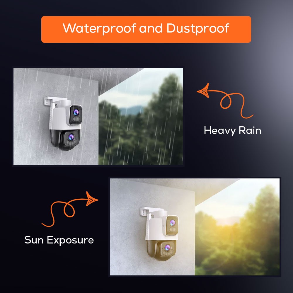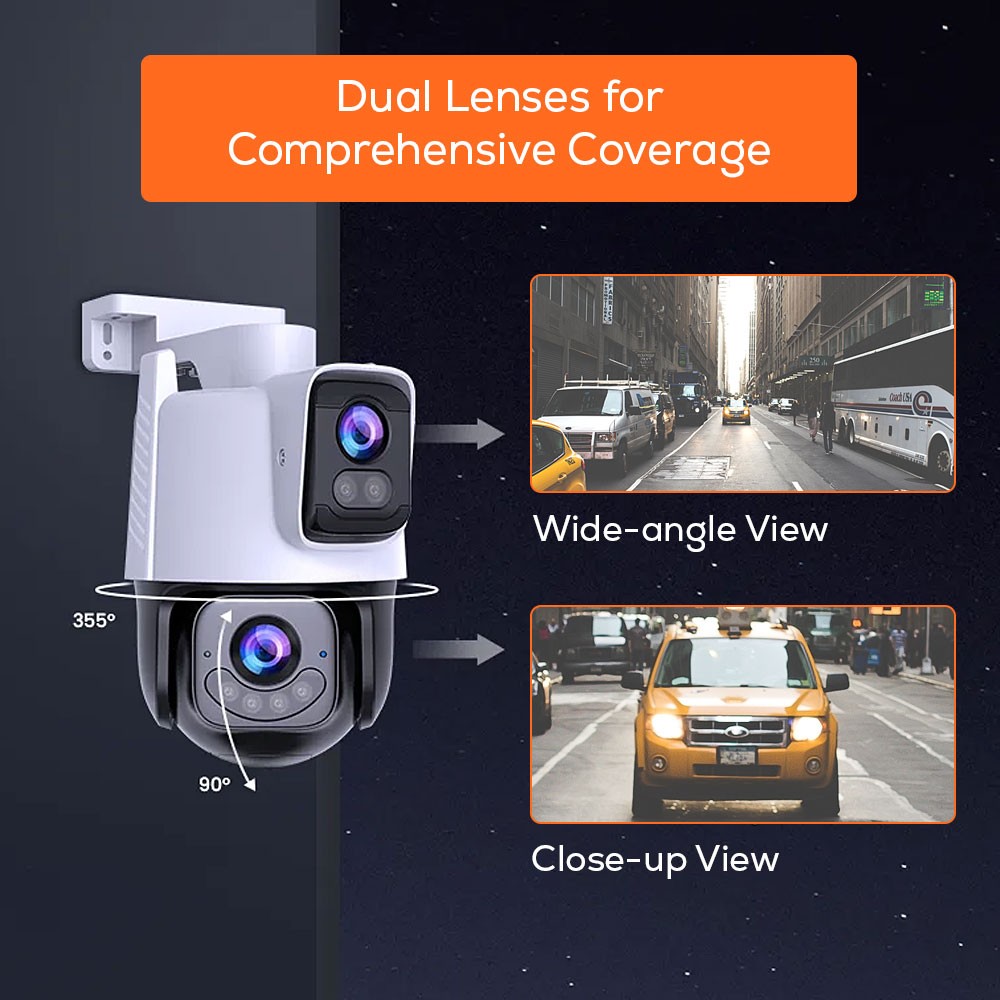 Experience unmatched security with dual 5MP lenses—wide-angle fixed and telephoto PT—providing simultaneous dual-area monitoring and full-color night vision. Advanced AI detection accurately identifies humans, vehicles, and e-bikes, triggering real-time sound and light alerts for complete perimeter protection.