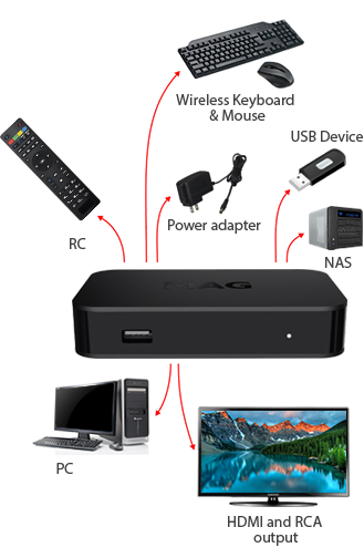 Standard set | MAG322 Set-Top Box, User Manual, HDMI cable, Power adapter 12V 1A, Remote control, 2 AAA batteries, Packaging |